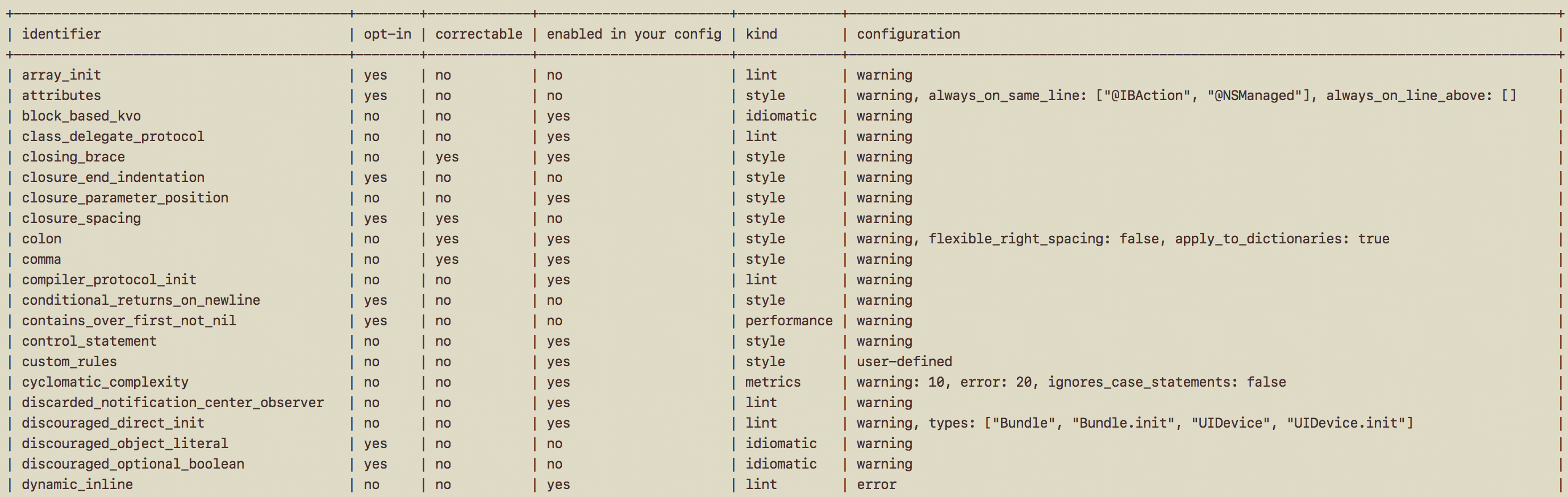 Now you are all set to SwiftLint all your code, but how do you decide what styles SwiftLint should enforce? Go back to Terminal, make the Terminal window as wide as possible and run swiftlint rules which will return a table like this (click to see full-sized image):